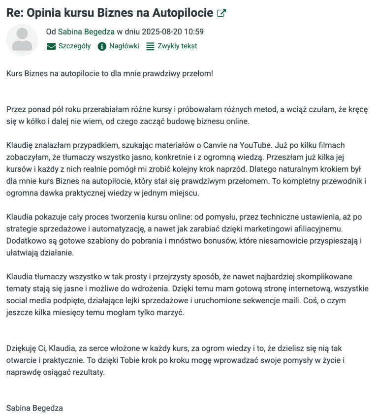 Korzystałam z kursów online przygotowanych przez Klaudię. Jej doświadczenie i system pracy dał mi wiele korzyści w biznesie. Przede wszystkim Klaudia w bardzo prosty sposób wszystko przekazuje. Przygotowane przez nią kursy są bardzo obszerne i wyczerpują dany temat. Także mogę z całą pewnością powiedzieć, że ma wiedzę w danym temacie i zależy jej na tym, aby kursanci osiągnęli dobre wyniki.
